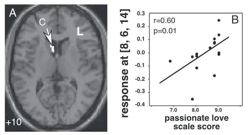 图源:参考文献[1](注:左图为激情之爱所激活的脑区,右图为激情之爱得分与激活强度之间的相关性。)