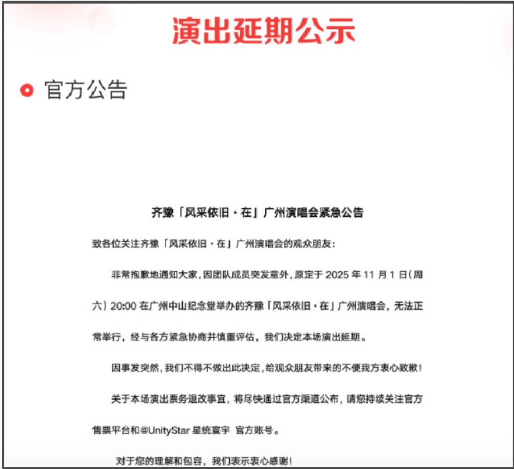 歌手齐豫原定在11月1日在广州举办演唱会,但因团队成员突发意外,宣布临时取消,引发了热议,之后有爆料称,齐豫演唱会音乐总监屠颖不幸离世了。